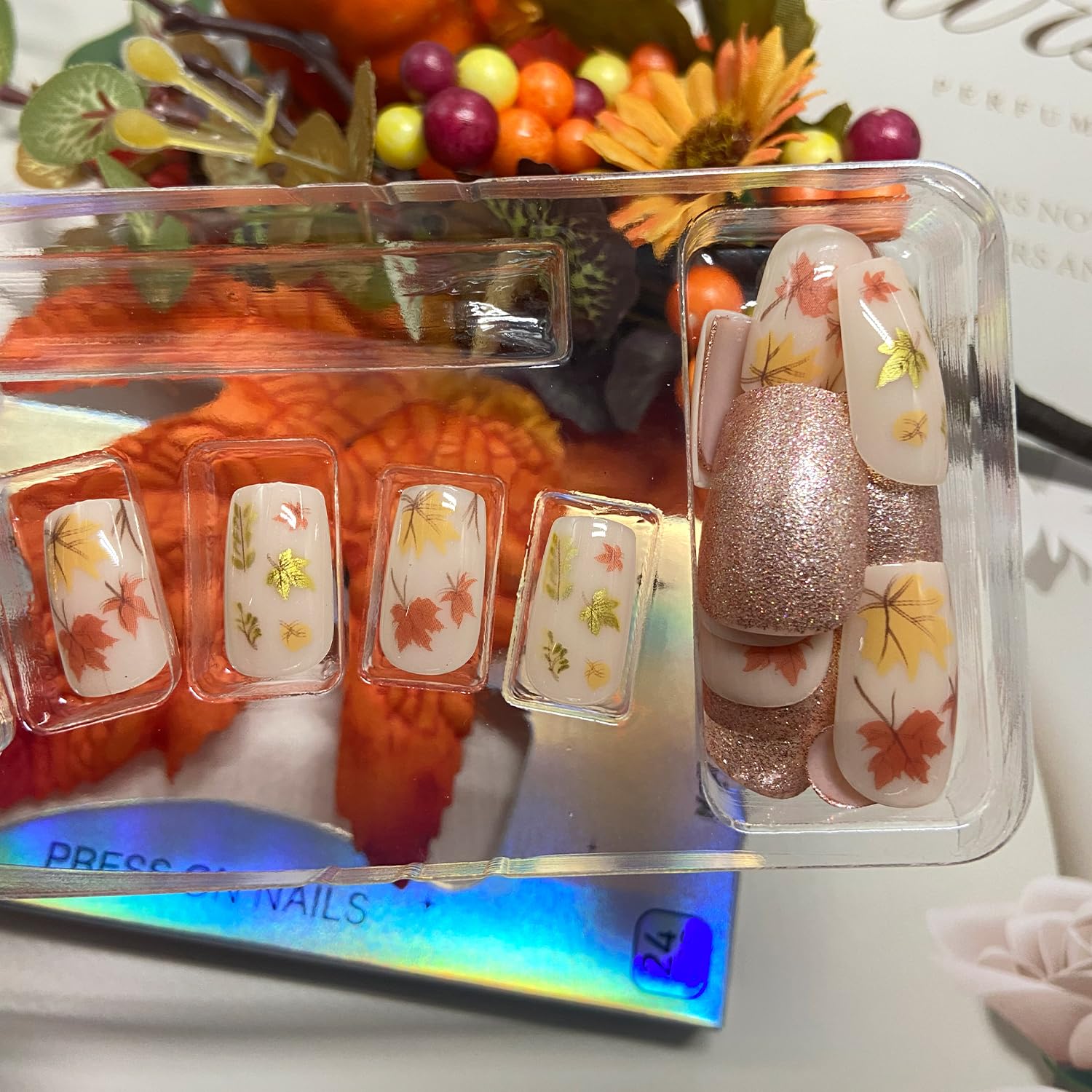 - Easy to Use: Instead of spend lots time and money at nail salon, you can change you nails style in 15 minutes anytime and anywhere. The maple leaves fake nails will stay longer if you clean your nails before use, and avoid water within the first hour of wearing