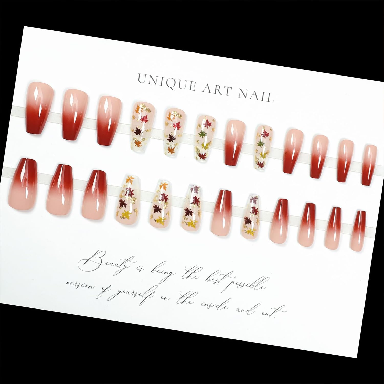 - Easy to Use: Instead of spend lots time and money at nail salon, you can change you nails style in 15 minutes anytime and anywhere. The maple leaves fake nails will stay longer if you clean your nails before use, and avoid water within the first hour of wearing