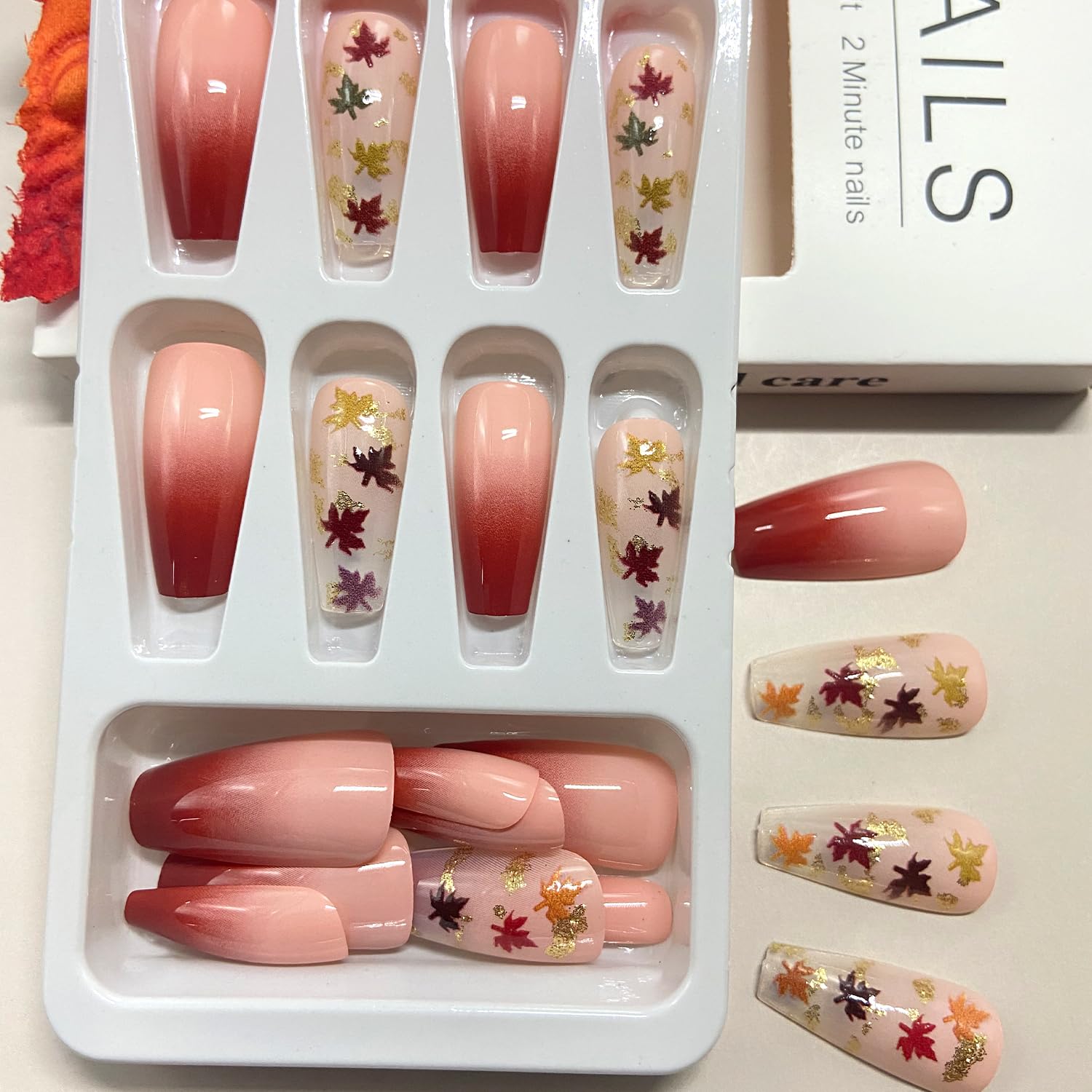 - Package: You'll get 24 fall maple leaf fake nails in 12 sizes. 1 mini nail file, 1 small wooden stick, 1 piece of adhesive tab glue. You can safely choose a fake nail that fits your finger size and DIY your desired nail shape
