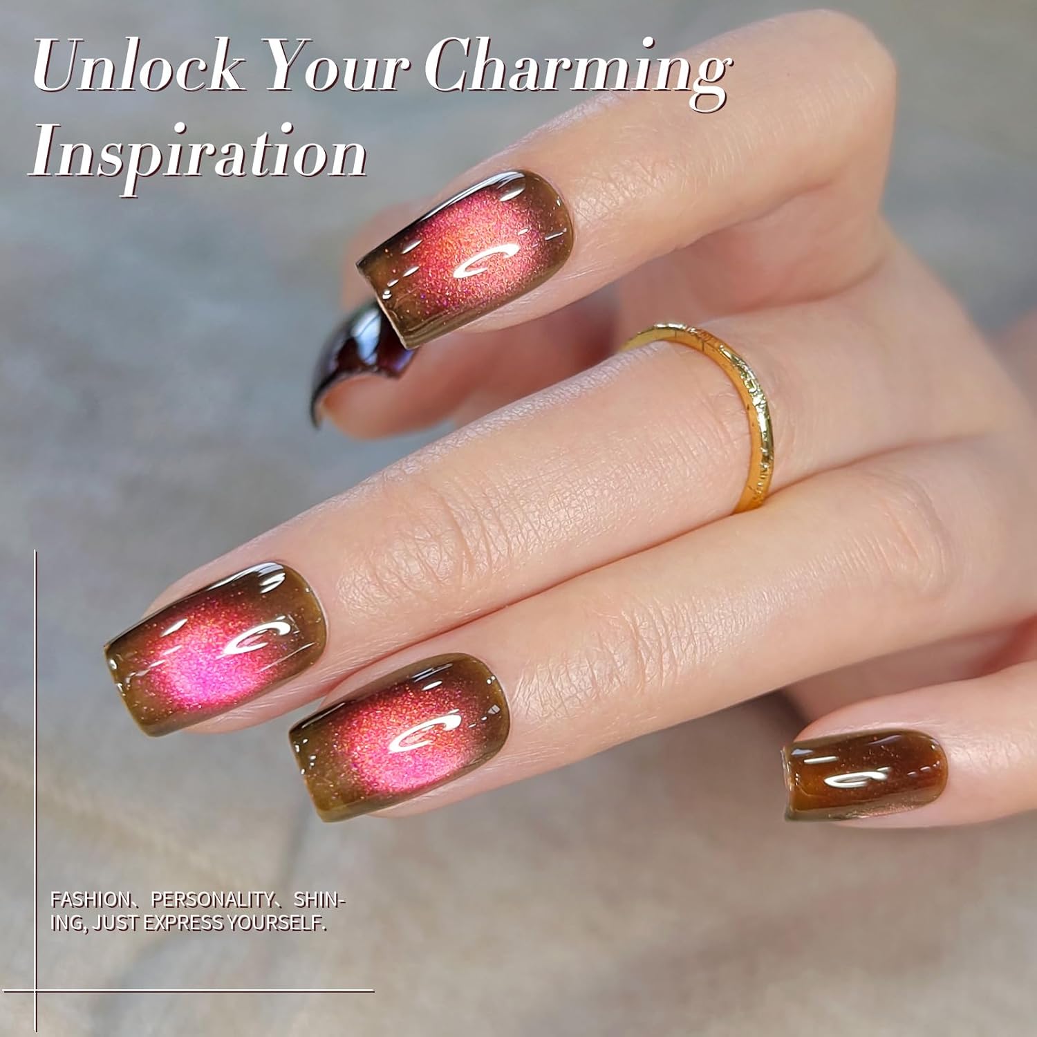 - PACKAGE CONTENTS: 1 bottle 15ml pink brown cat magnetic eye gel nail polish, compared with traditional gel polish, our magnetic gel nail polish has a higher gloss and silky effect, just like ceramic gloss, making your fingertips bloom with attractive charm. This Retro cat magnetic eye gel nail polish will appear differently in different angles and light
