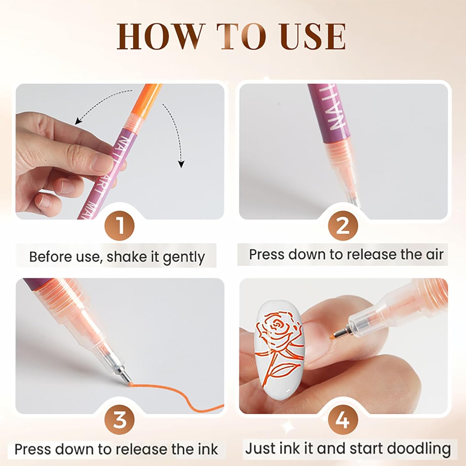 - Simple Maintenance Tips: To keep your nail art brushes in top condition, always cap them when not in use to prevent drying out. For first-time users of our nail doodle pens for kids and adults alike, gently press the tip to release ink. Should you have any questions, our dedicated customer service team is ready to assist you with your nail art supplies.